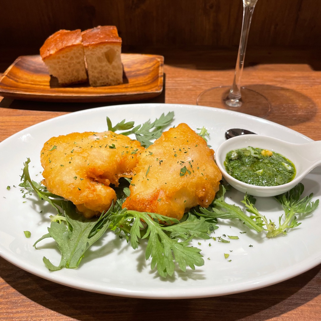 自家製マリネした揚げた鶏ムネ肉のフリット、外はサクッと、中はしっとりフワッと。パセリのサルサヴェルデでいただきます。