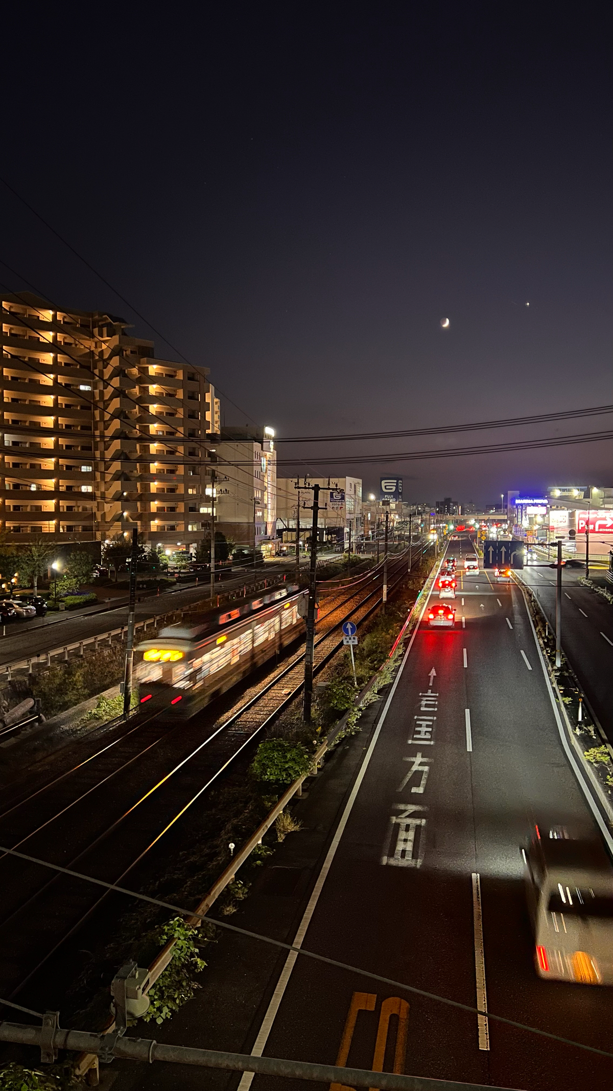 月と金星が近づく時期に阿品駅近くの陸橋から撮影しました。電車があたかも月に向かって走っているような角度で撮影してみました。