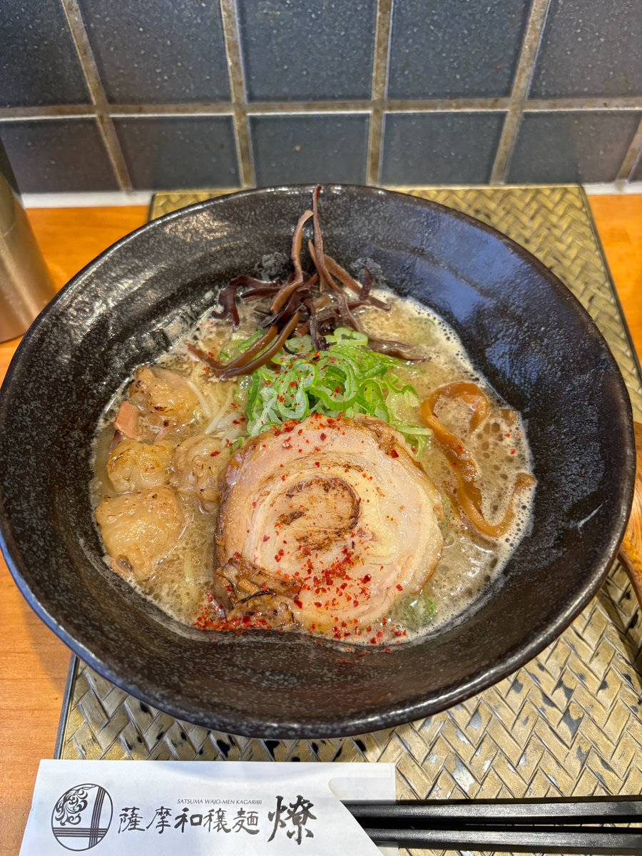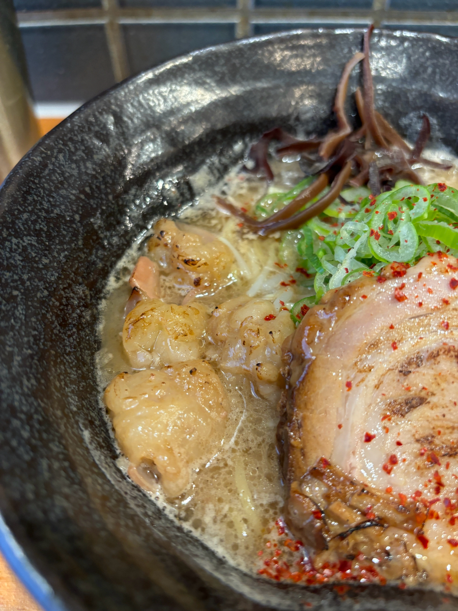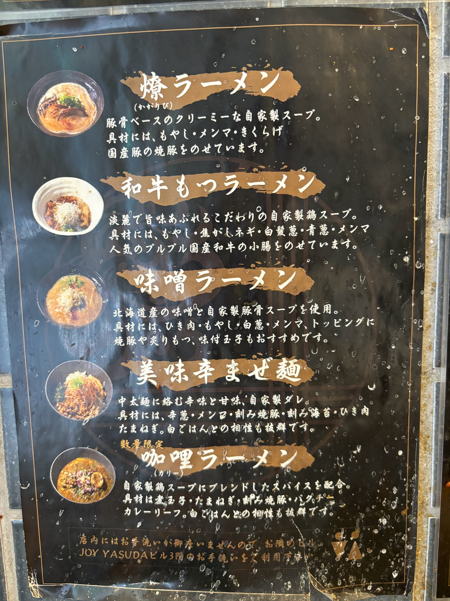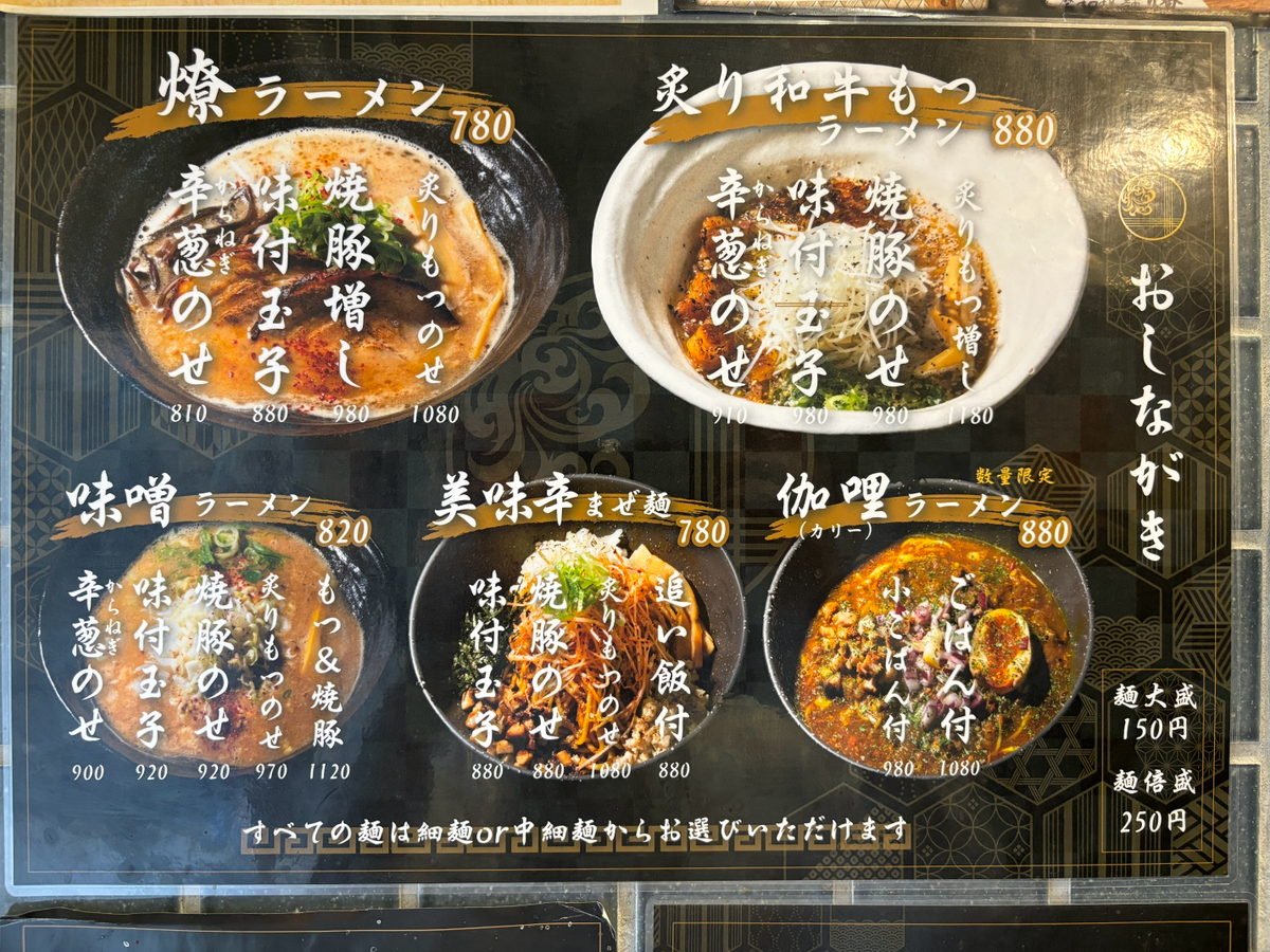都通駅すぐのラーメン屋 燎(かがりび)。 ラーメンはとんこつ、鶏ガラ、味噌、混ぜそば、カレーのご種類があります。今回は豚骨ベースの燎ラーメンを注文しました。豚骨のクリーミーさと細麺とがしっかり絡んでとても美味しかったですが、出来れば炙りモツをトッピングして食べて欲しいです。 モツもプリプリで食べ応えがあって全く臭みもなくとても美味しかったです😊 平日のお昼は11時半ぐらいから行くのがオススメです!