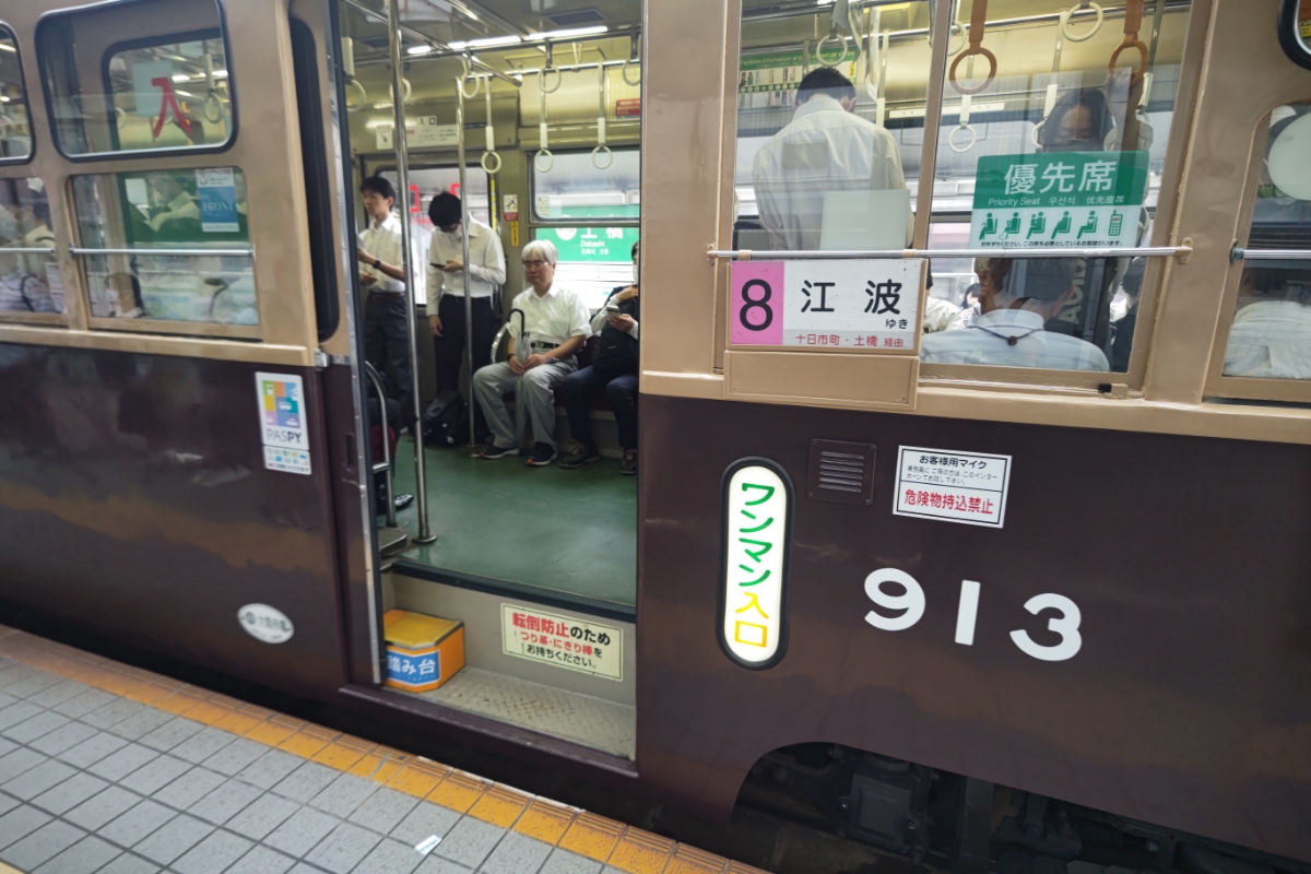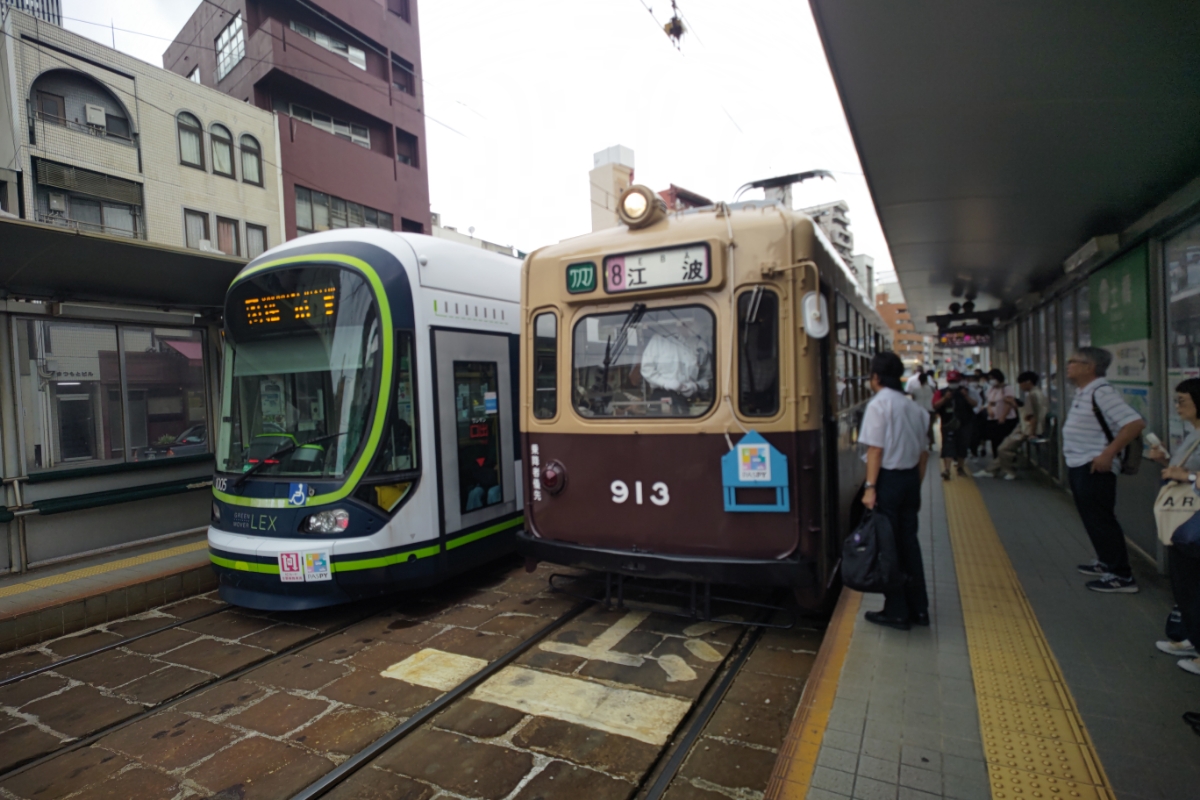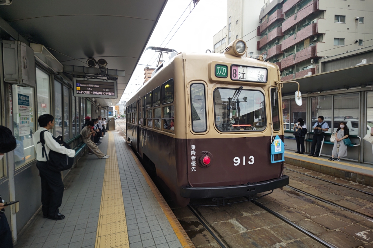 広電913との初コンタクトは2024年7月の曇りの朝の土橋電停。3系統日赤病院前行きに乗車中、土橋で8系統江波行き運用中にすれ違ったことが始まり。 この日は気づくのが遅れて撮影出来なかった。運用を推定し、挑戦3度目で撮影&乗車出来た。 朝の通勤途中で短時間の乗車だったが、土橋電停では時間調整で少し長く停車したので、913の普段の様子を撮影出来た。 土橋電停は3系統も通るので、レアな単車に遭遇したいなら紙屋町西~十日市町並みのホットスポットと個人的には思っている。