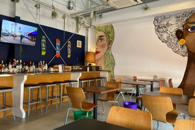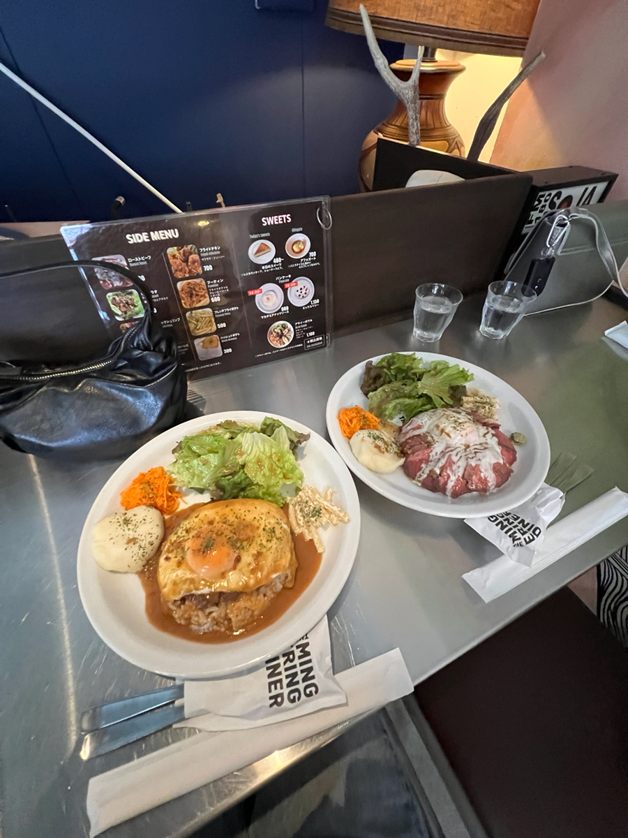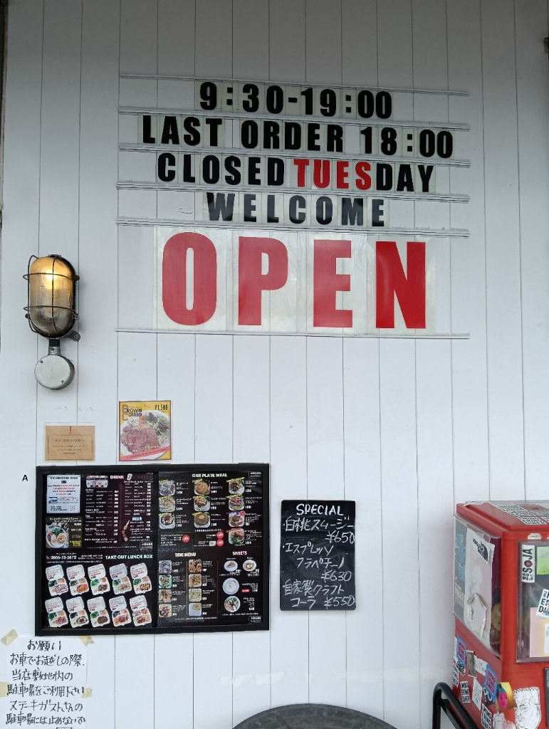 店内アメリカンな雰囲気 ご飯は1300円くらいで食べれる アサイーボウルもある🫐 外にあるステッカーのガチャガチャが100円で回せる たまに音楽イベントも🎵