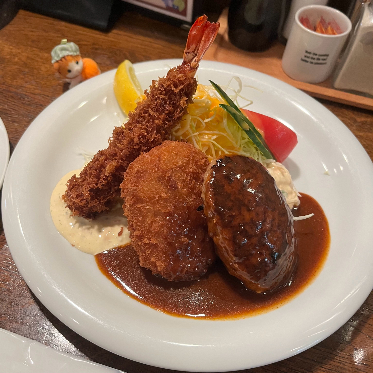 大阪・梅田の地下街にひっそりと佇む「ぶどう亭」は、洋食好きの心を鷲掴みにする名店です。大阪駅前第3ビルの地下2階に位置し、連日行列が絶えない人気ぶり。その魅力は、昔ながらの洋食をリーズナブルに楽しめる点にあります。   「ぶどう亭」の看板メニューは、ジューシーなハンバーグ。外は香ばしく、中はふっくらと仕上げられた逸品です。また、エビフライやコロッケ、カットステーキなど、洋食の王道を網羅したセットメニューも豊富に揃っています。 写真は王道ミックスAセット(スープ・ご飯大盛りが付いて)1200円