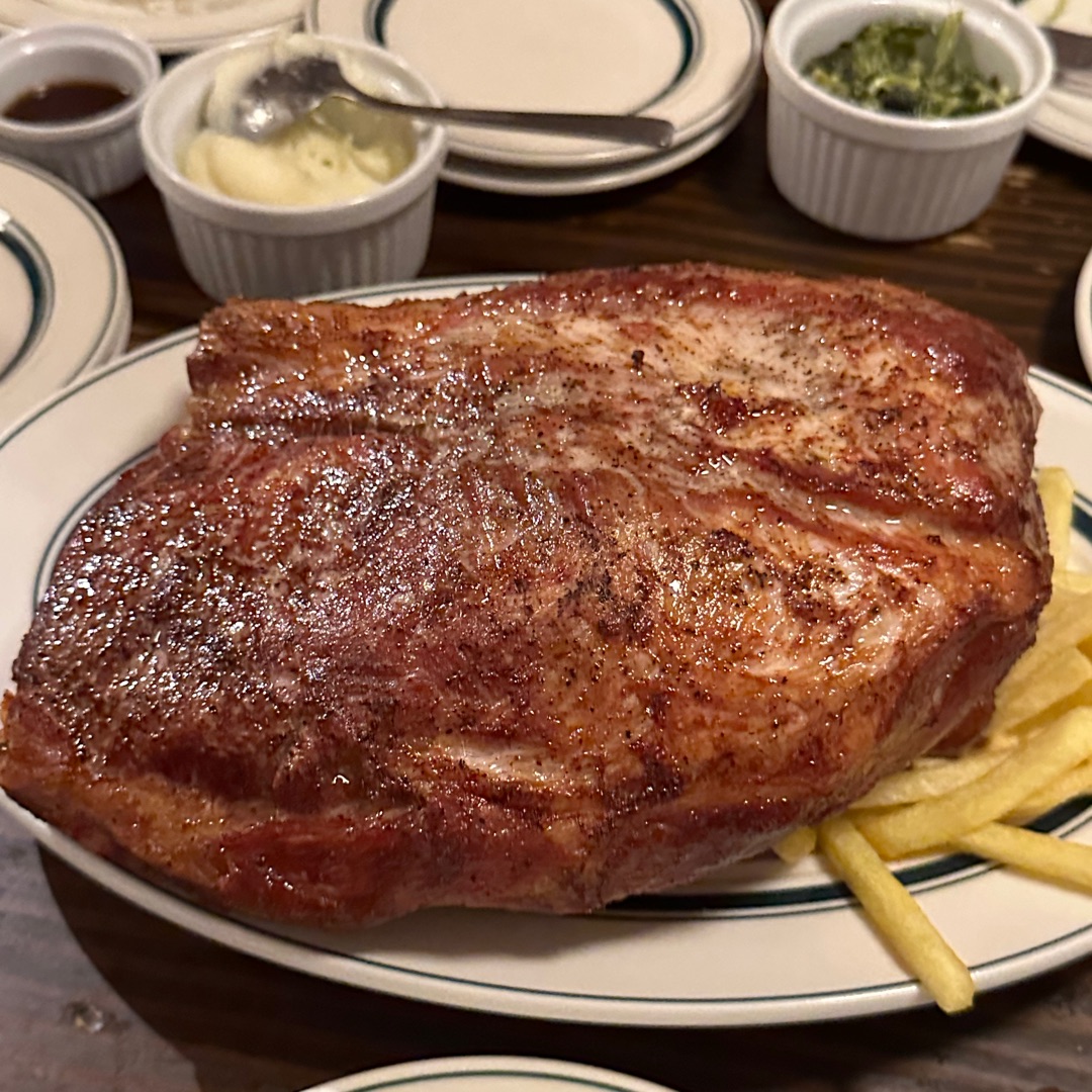 さすがの迫力 ポークステーキは安心の美味しさ つけ合わせのクリームスピナッチも美味しい 歓送迎会にも是非ご利用を