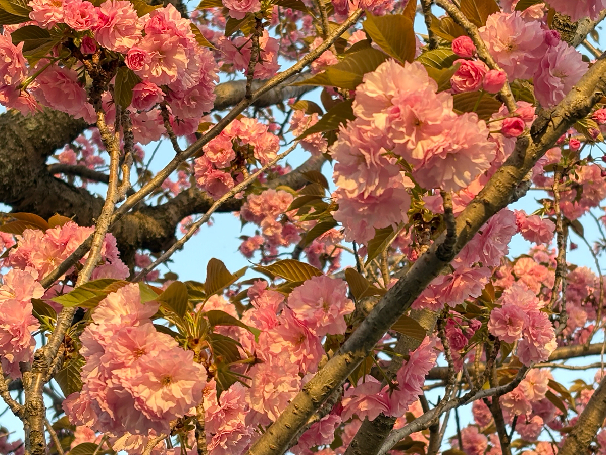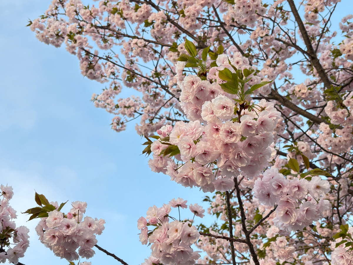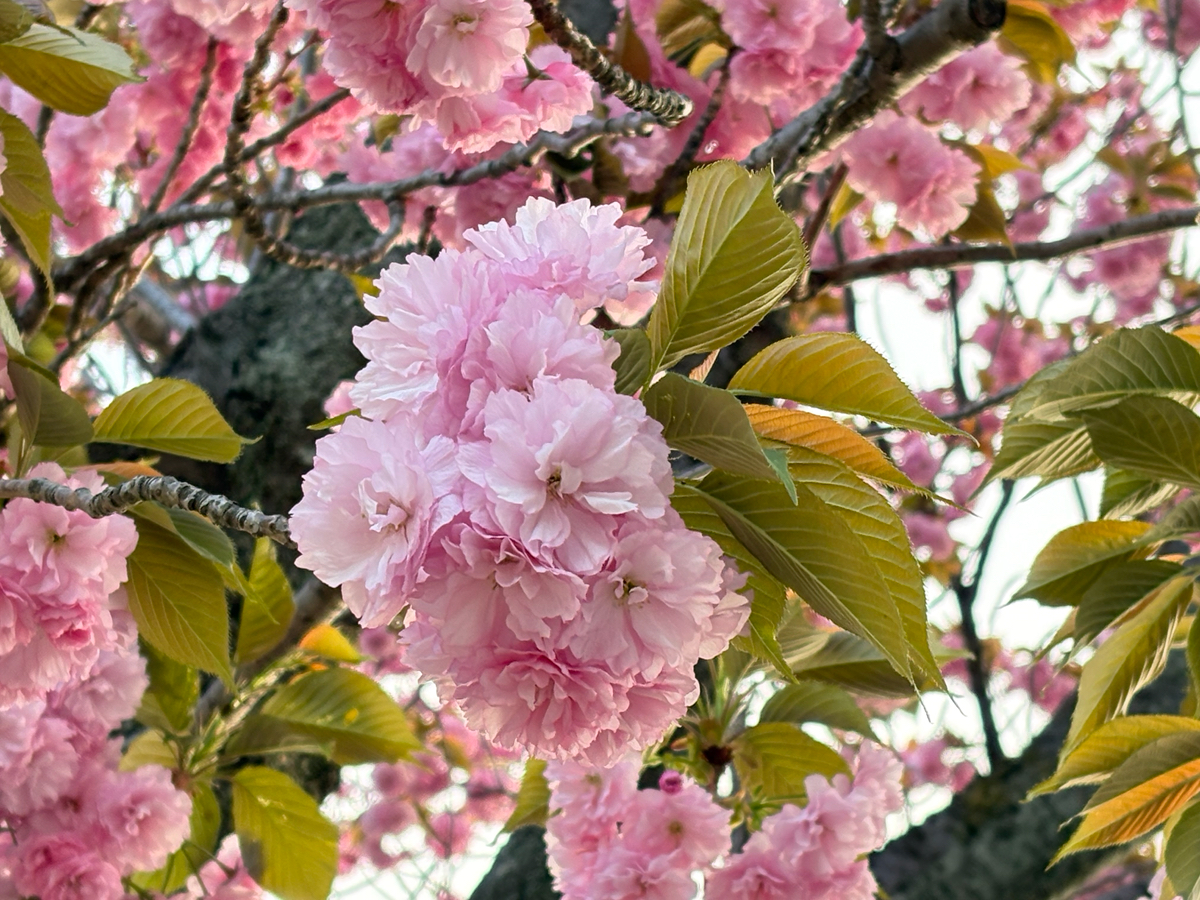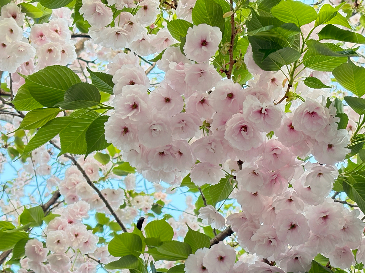 葉桜になったソメイヨシノと、満開の八重桜です。