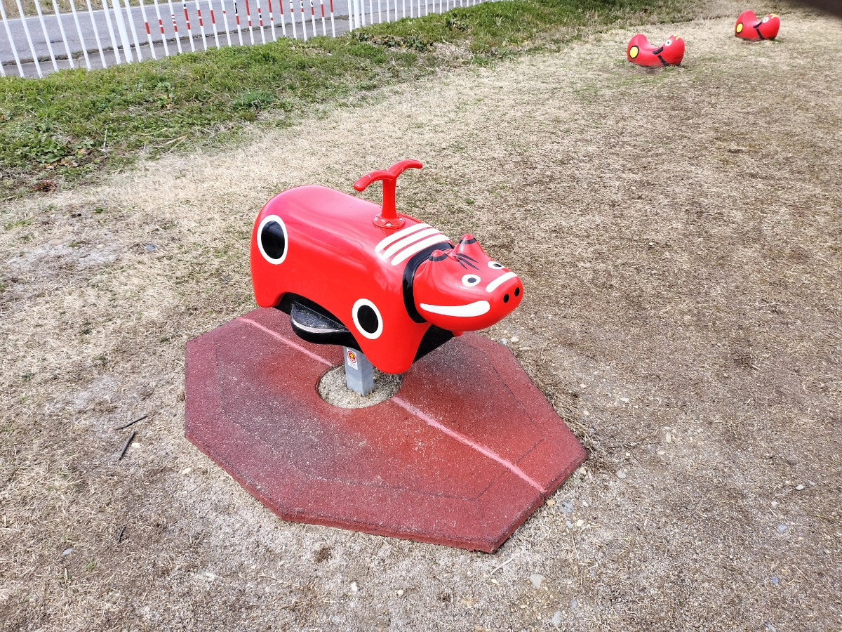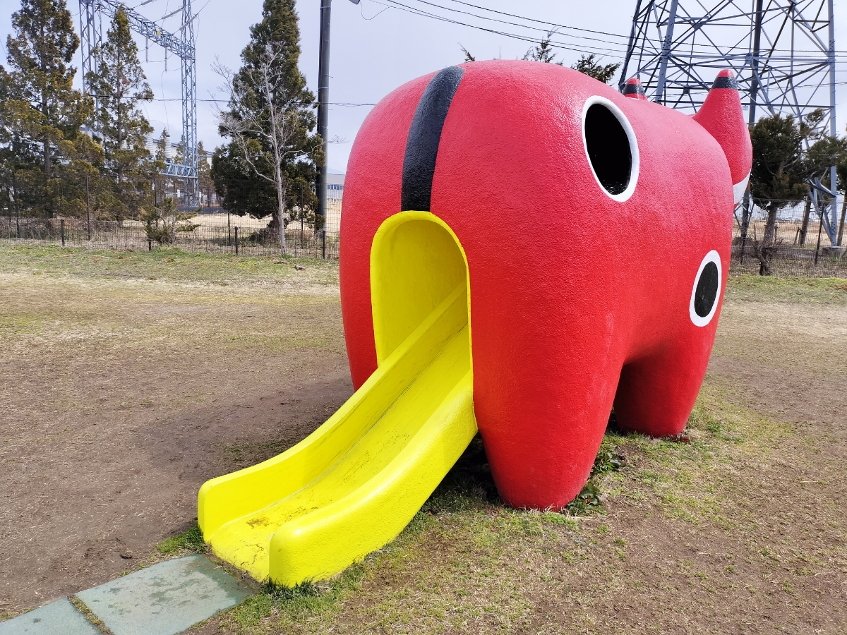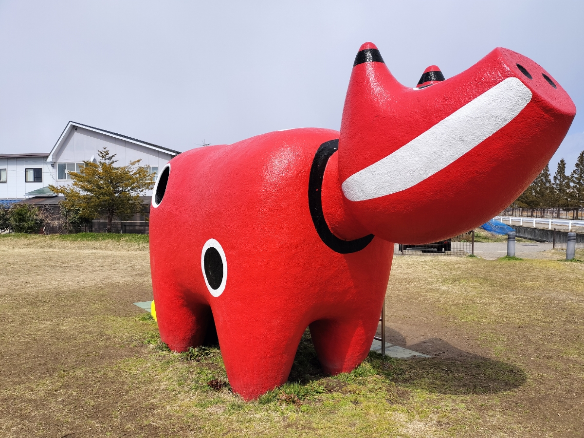 TV版にゃん旅鉄道でらぶちゃんやさくらちゃんが訪れたことのある赤ベコ公園。 こぢんまりした公園で、大きな赤ベコさんのすべり台がインパクト大です。