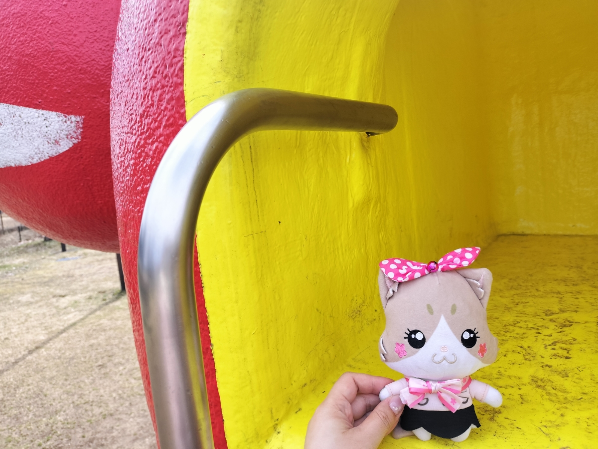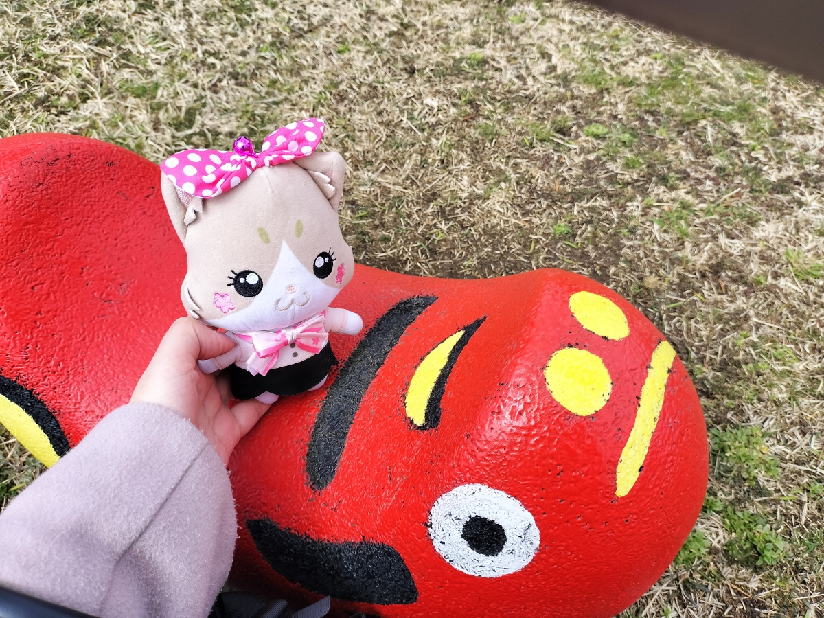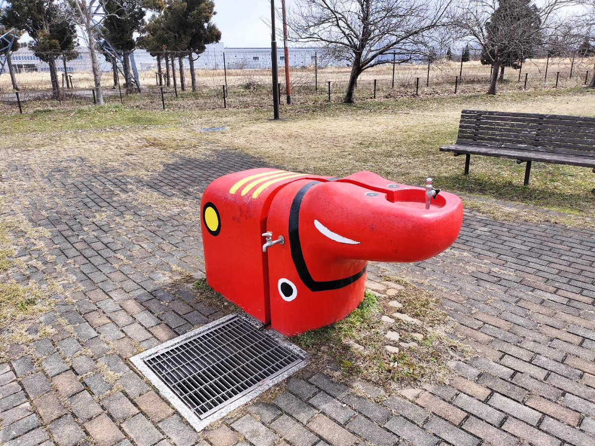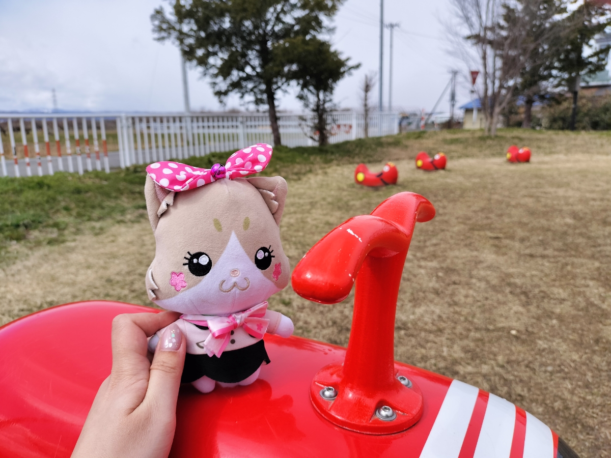 TV版にゃん旅鉄道でらぶちゃんやさくらちゃんが訪れたことのある赤ベコ公園。 こぢんまりした公園で、大きな赤ベコさんのすべり台がインパクト大です。