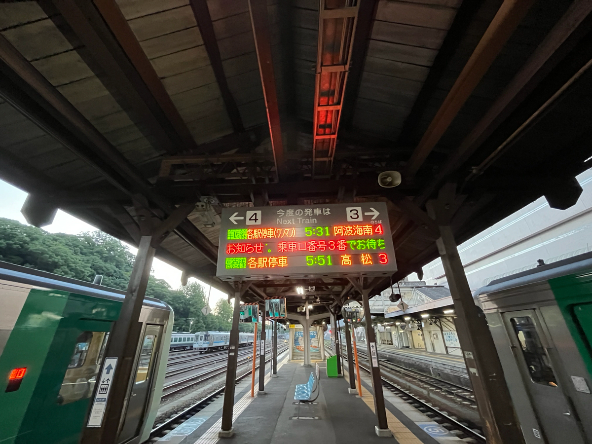 徳島駅始発で、阿波海南駅まで向かいます。 今回は日程の関係でこの区間を往復することになりますが、ドンナ沿線の風景を堪能できるか楽しみです。 この列車は一両編成ですので、青春18切符の時期はお早めにホームまで。 ちなみに徳島駅は0515に改札が開きます。