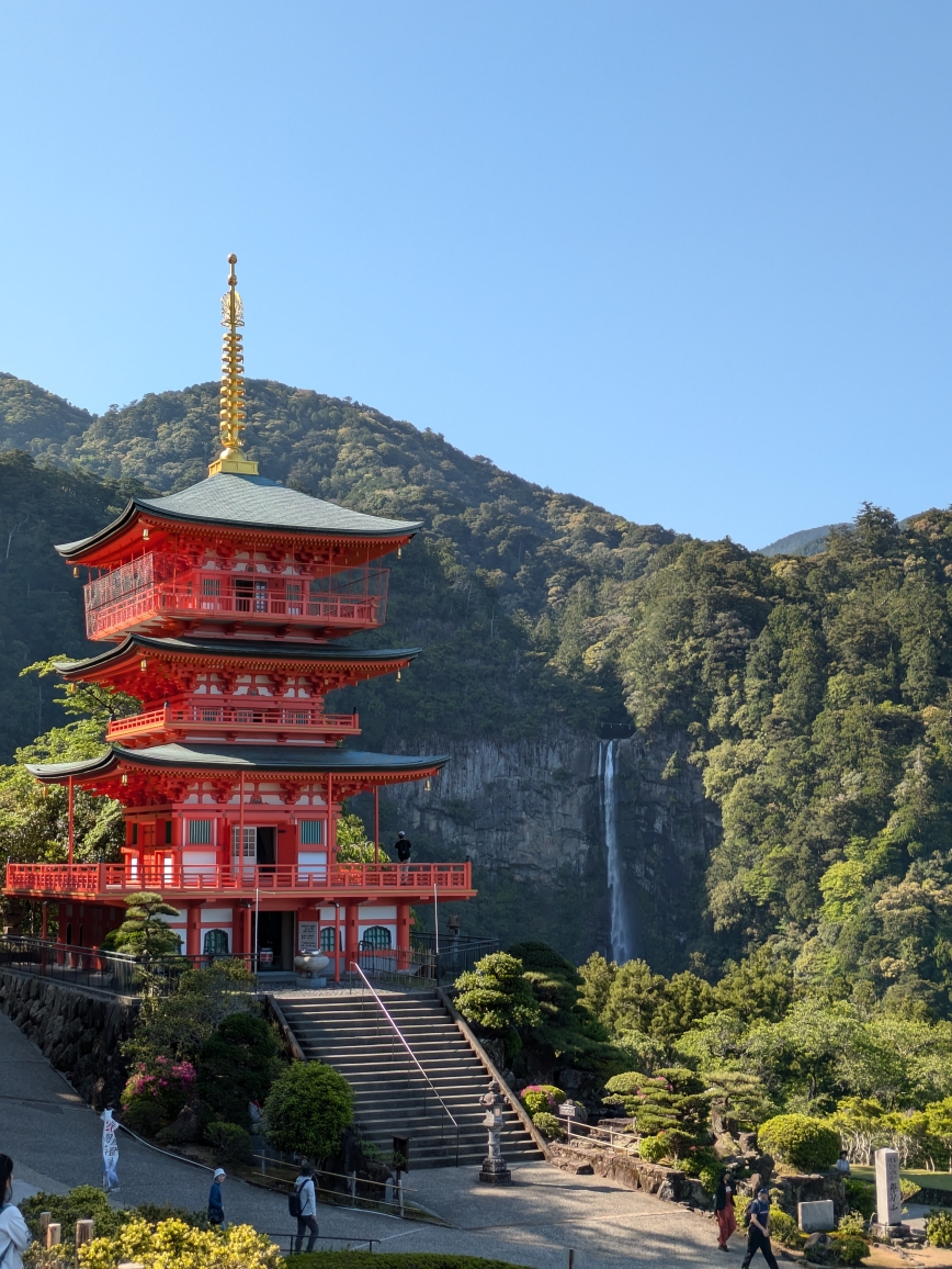 ツーリングスポットの情報を最寄りの鉄道駅から紹介します 4/29〜5/1 で南紀ツーリング 有名な熊野那智大社です 訪れているのはヨーロッパ、台湾(かな?)の方ばかりでした 皆さん 那智駅から出ている路線バスで移動