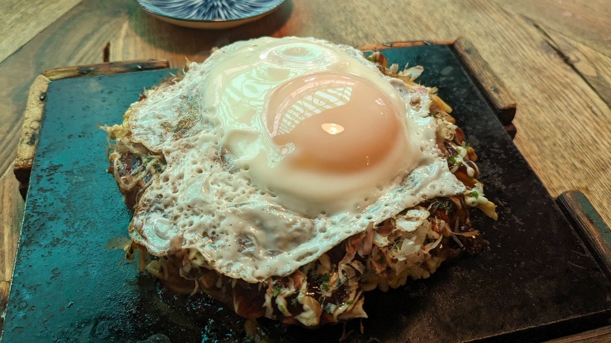 お好み焼き、ねぎ焼き、焼きそばなどが楽しめるごはん屋さんです!写真はモダン焼きの目玉焼きトッピングでとても美味しかったです! 駅から歩いて五分くらいのところにあります