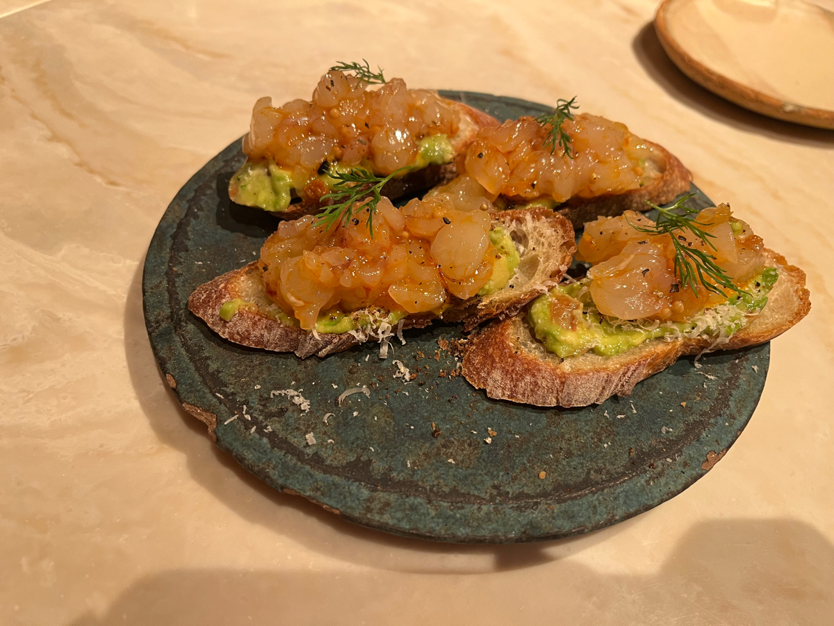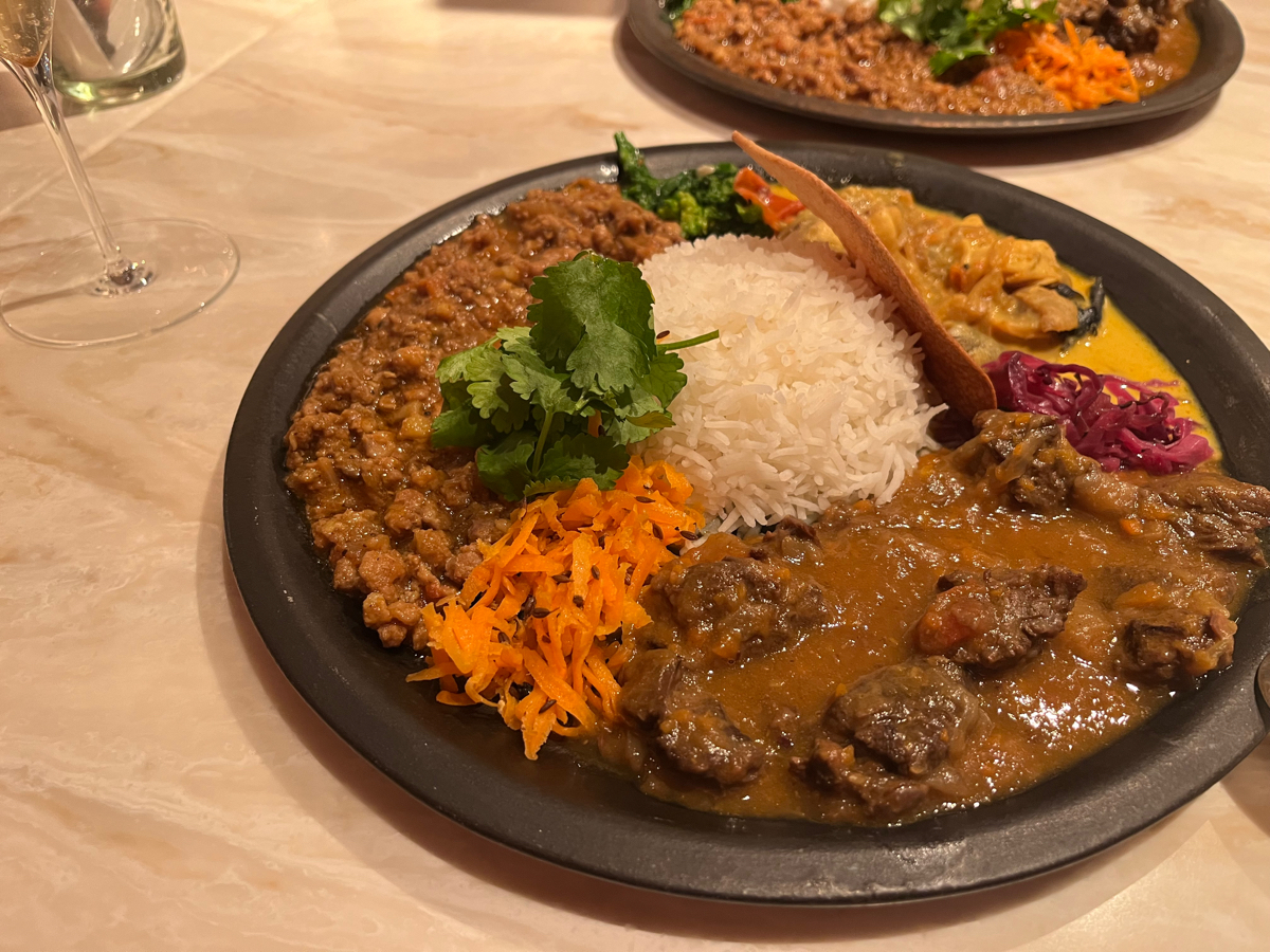 3つの味のカレーを一度に楽しめました!様々な食材で食感も変えることができてとても満足感の高いカレーでした。 一緒に食べたエビとアボカドが乗ったバケットも見た目にも美しく、味もとても美味しかったです。