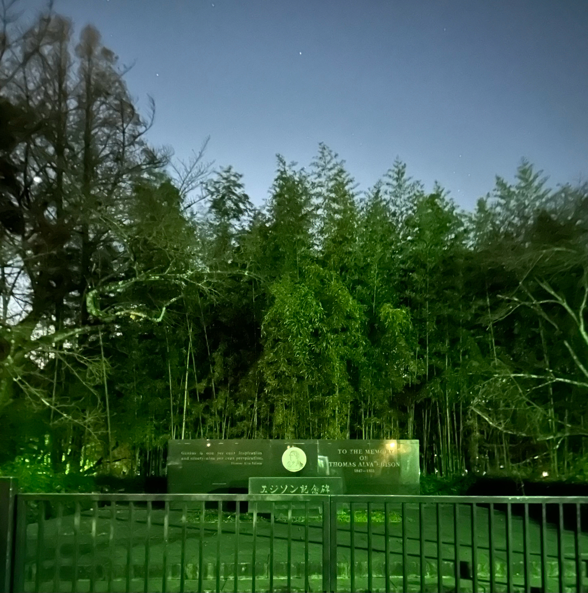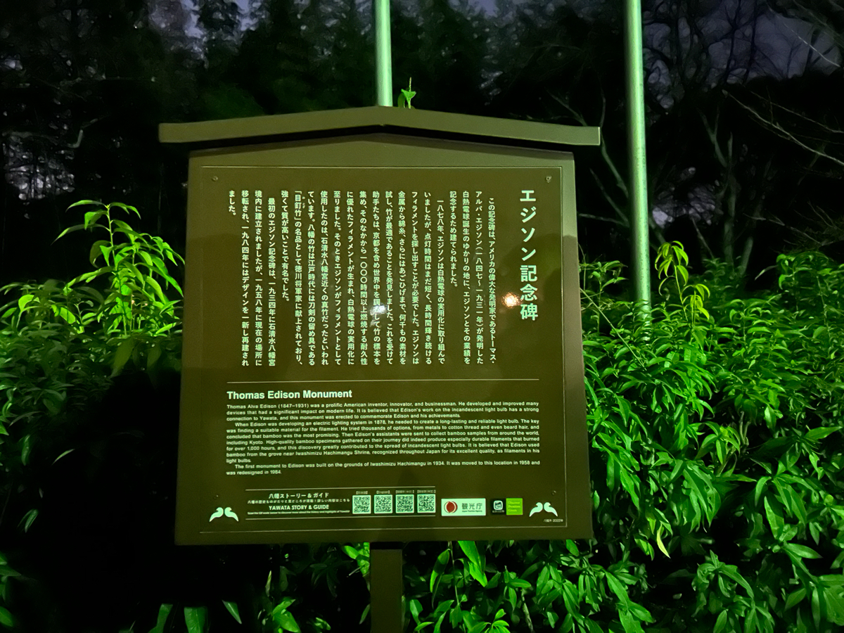 国宝・石清水八幡宮の本社西側の広場や駐車場がある一画にこの「エジソン記念碑」が設置されている。これは、トーマス・アルバ・エジソンが白熱電球の実用化に使用されたフィラメントが八幡の真竹だったことから、この業績を記念して設置されているのである。 ぜひ、石清水八幡宮に訪れた時には一緒に足を運んでみてはいかがでしょうか。