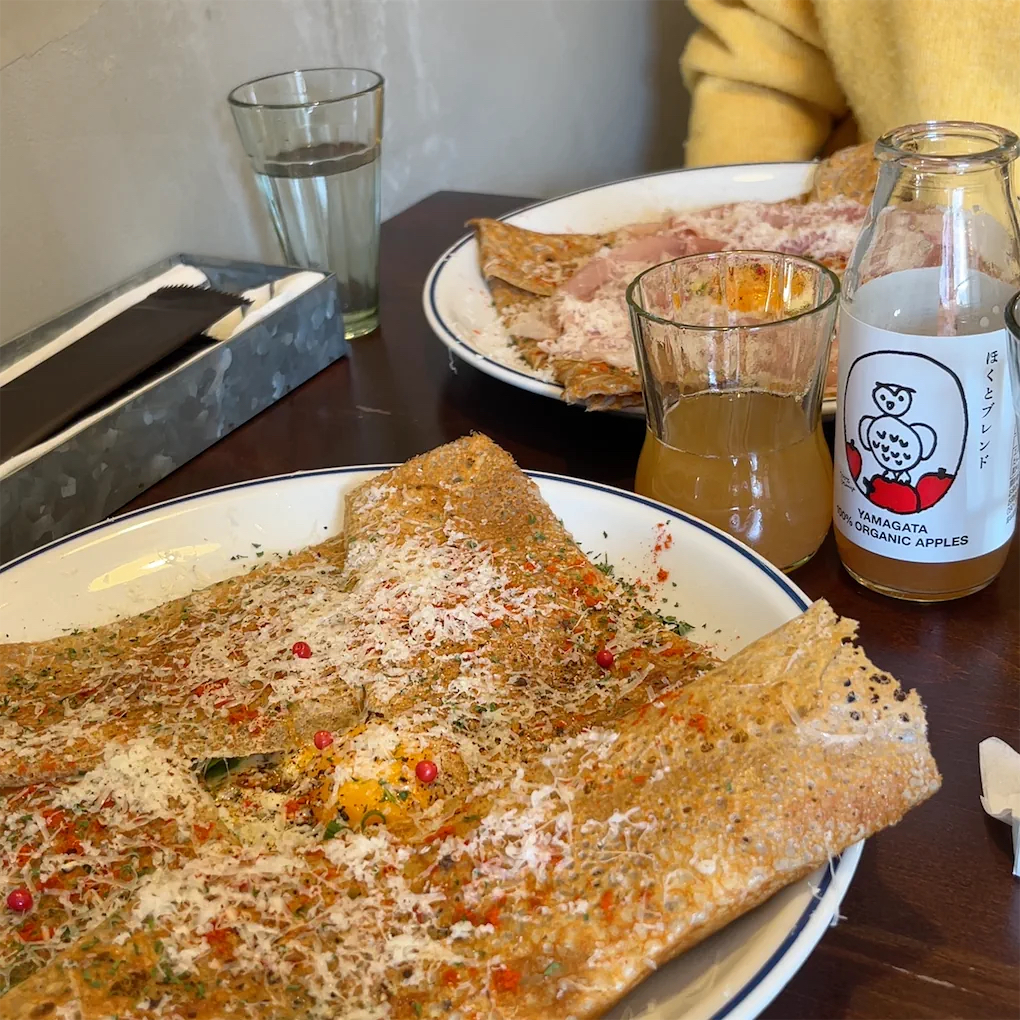 布田駅から徒歩1分ほどの「Oklm」でガレットランチ🍴 サクサクもちもちの生地とマッシュルームなどの具材がよく合って感動でした☁️ 「ほくとブレンド」というりんごジュースもとてもおいしかったです!