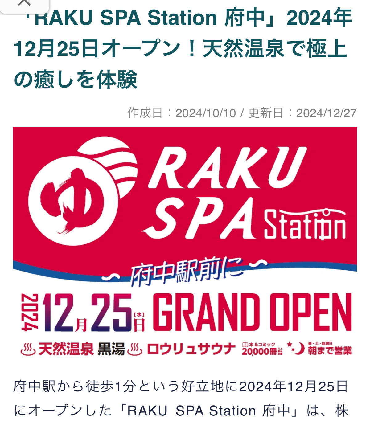 2024年12月25日にリニューアルオープン! 黒湯温泉とか泊まれる施設というのが売りのようです。 駅近なのもポイント高いですね! ◆Fより笹塚乗り換えで60分 行ってきましたー! 場所は本当に駅からすぐで、見た感じ雑居ビルに入ってる感じ! こじんまりかと思いきや、意外と大きかったです。6階〜12階まであります。 【お風呂】 まず、館内着と大小タオルレンタル付きなので、土日2400円とやや高めだけどフリータイムです。ロッカー大きめが結構嬉しい♥️ お風呂は重厚な石造りで大きめの浴槽がボンボンとある感じ。 黒湯温泉が身体に染みる🎵 露天風呂は名ばかりで、実際は外気が少し入る程度。 場所柄仕方ない💦 あと、欲を言えばジャグジーより、寝転び湯が欲しかったな! 脱衣所からは女性専用休憩スペースにも繋がっていて、週末は+2300円で泊まれます。チェックアウトは8:00。 【サウナ水風呂外気浴】 サウナは女性側は50℃のミストサウナのみでした!あちゃー💦 でもサ室は広くて、75%が寝サウナスペース、残り25%は2段サウナ。そして一つ一つに何種類かの岩盤が貼ってある。つまりはスチーム岩盤浴ですね、これは。 水風呂は19℃で優しめ! 露天にはアデイロンダックチェア2個と普通の椅子1個、ここはアディロン4つ置けそうだけどなぁ! ただ土日なのにガラガラで、スチーム岩盤浴も黒湯温泉ものんびり思う存分堪能しました! そうそう、学園アイドルマスターとコラボしてました!限定メニュー頼んでた人もちらほら居たので、コラボ効果もバカになりませんね! 他ゴロゴロスペースやコワーキングやマンガ本……のんびり要素もたくさんあって、駅近だし、コスパ良いと思います! ただ、女性側高温サウナ無いから、正直もう来ないかな? (男性側はしっかり熱いオートロウリュサウナあるけどね!男女格差プンプン💢💢)