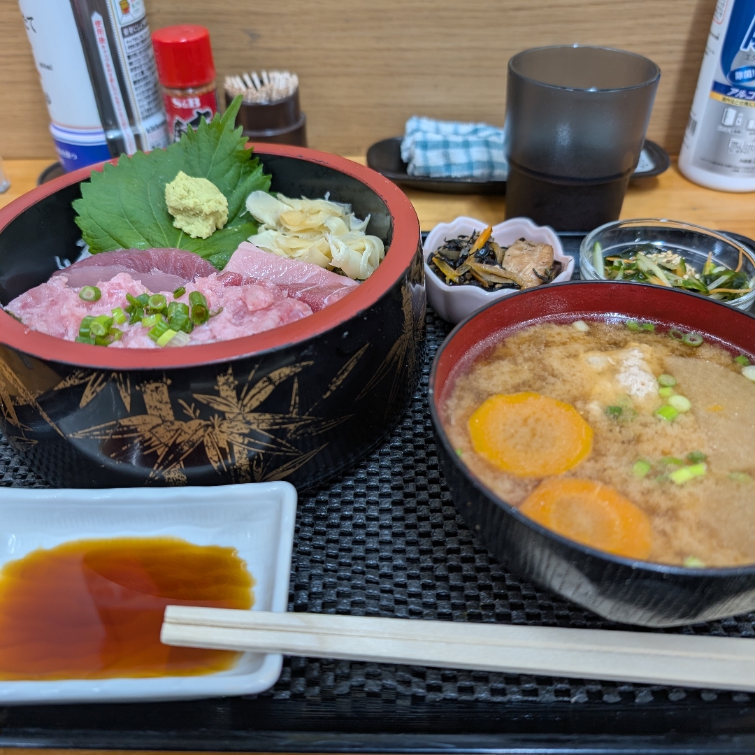 さんざん悩んだ末に中とろ、赤身、自家製ねぎとろの3色丼にしました。小鉢2品とまぐろ団子汁付きです。