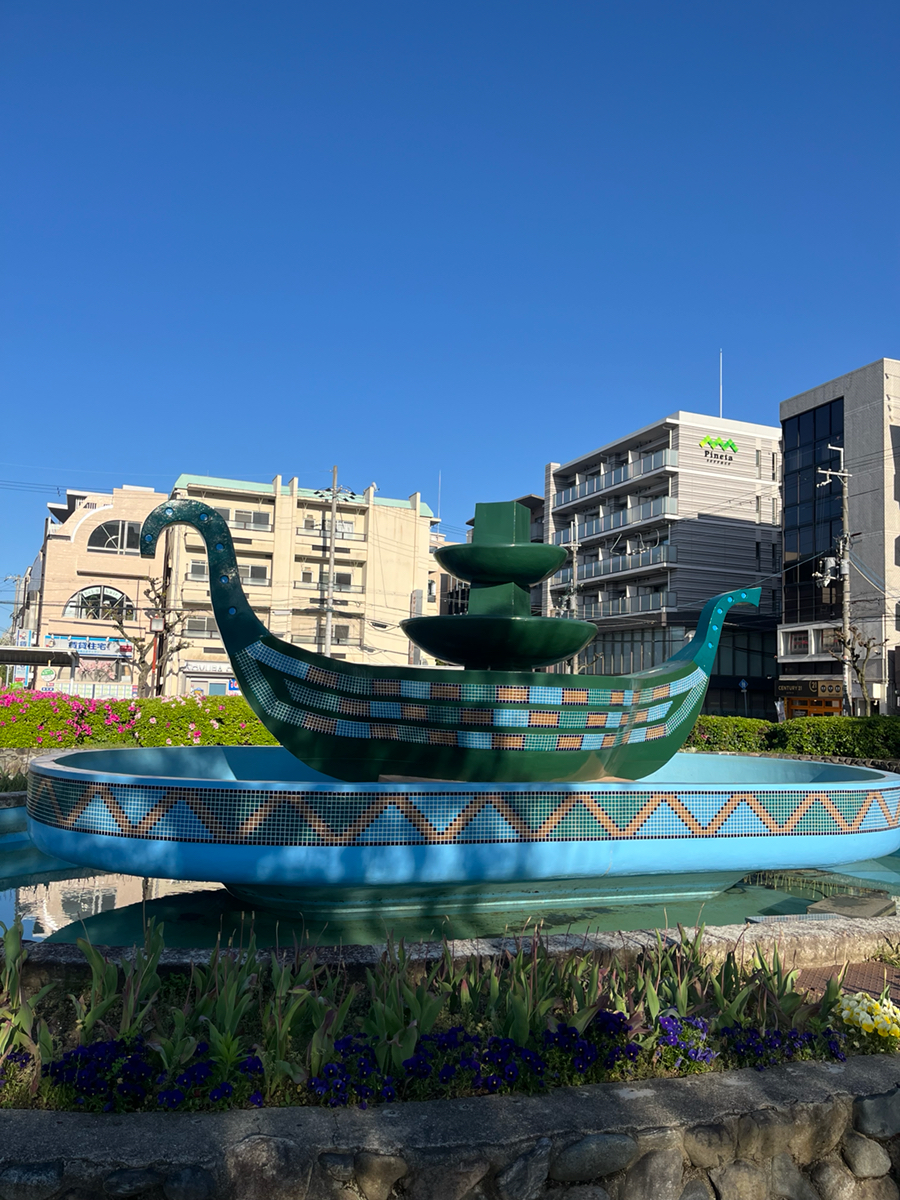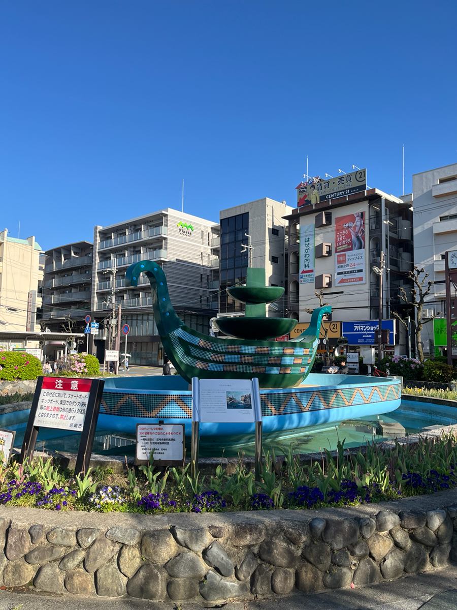 阪急武庫之荘駅(尼崎市)のロータリー付近にある大きな噴水です。 大きなゴンドラの形をしており、周りにはお花が植えられていました。 近くにはベンチがあり友人同士でおしゃべりしたりと地域の人の憩いの場となっています。