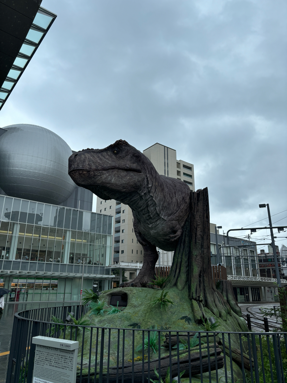 駅前のロータリーに動くティラノサウルスが! 迫力満点で子供は喜びそう!