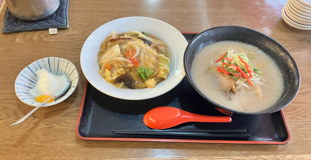 この場所に昔からある中華料理屋さん。 日替りランチは、800円 今日の日替りは、中華丼と、豚骨ラーメンでした。 デザートとして、杏仁豆腐が付いてきます。