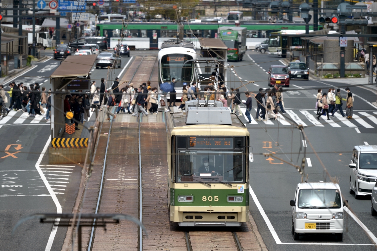 電車通りは元は外堀と運河。本通りは西国街道で今も多くの人が行き交います。2022.4.2撮影
