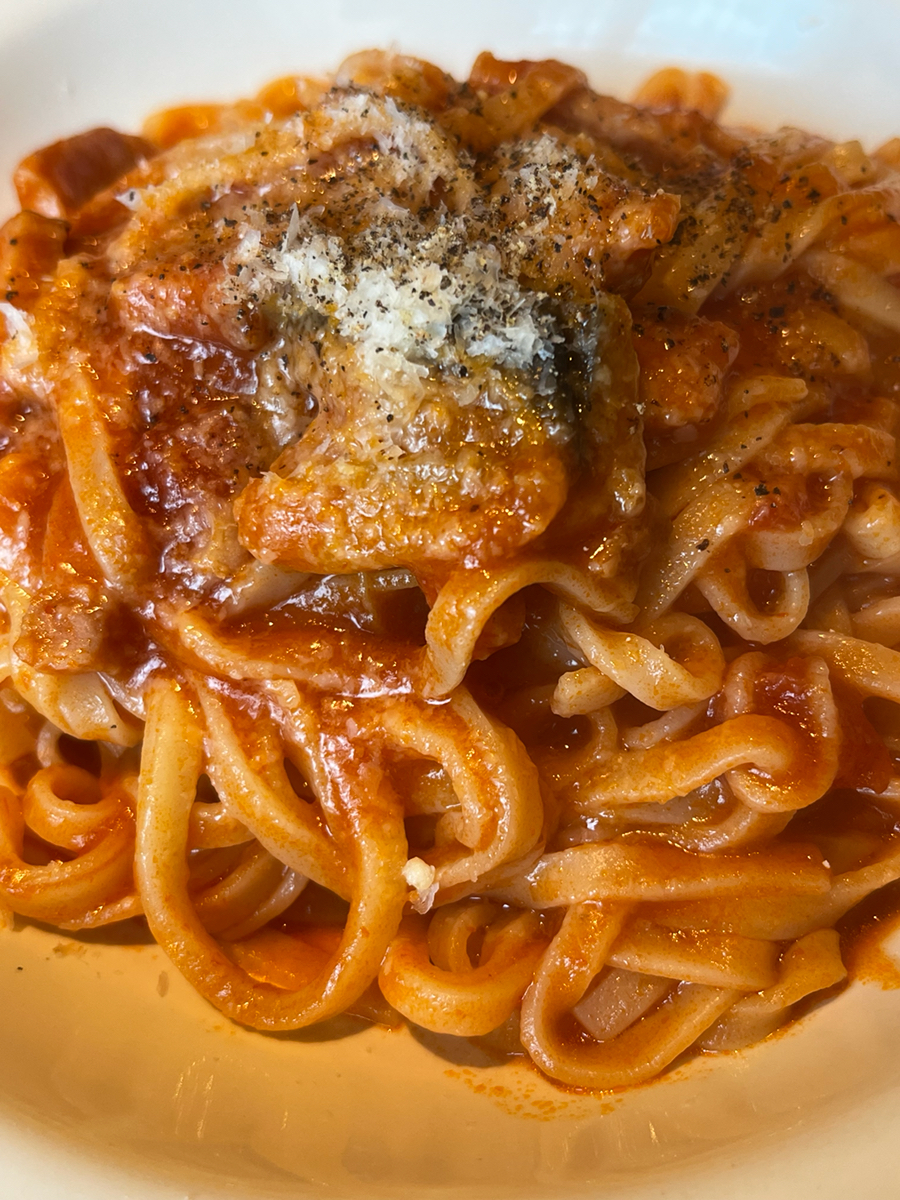 姪浜駅から徒歩4分。間口は狭そうだけど奥が深い店内はイタリアにある小さなカフェ風のオープンキッチン。パスタランチは、サラダ、スープ、日替わりパスタ、おかわり自由のパンにドリンク、デザートもついて1480円(税込)でお得感至高でした。接客も丁寧で好感が持てます。
