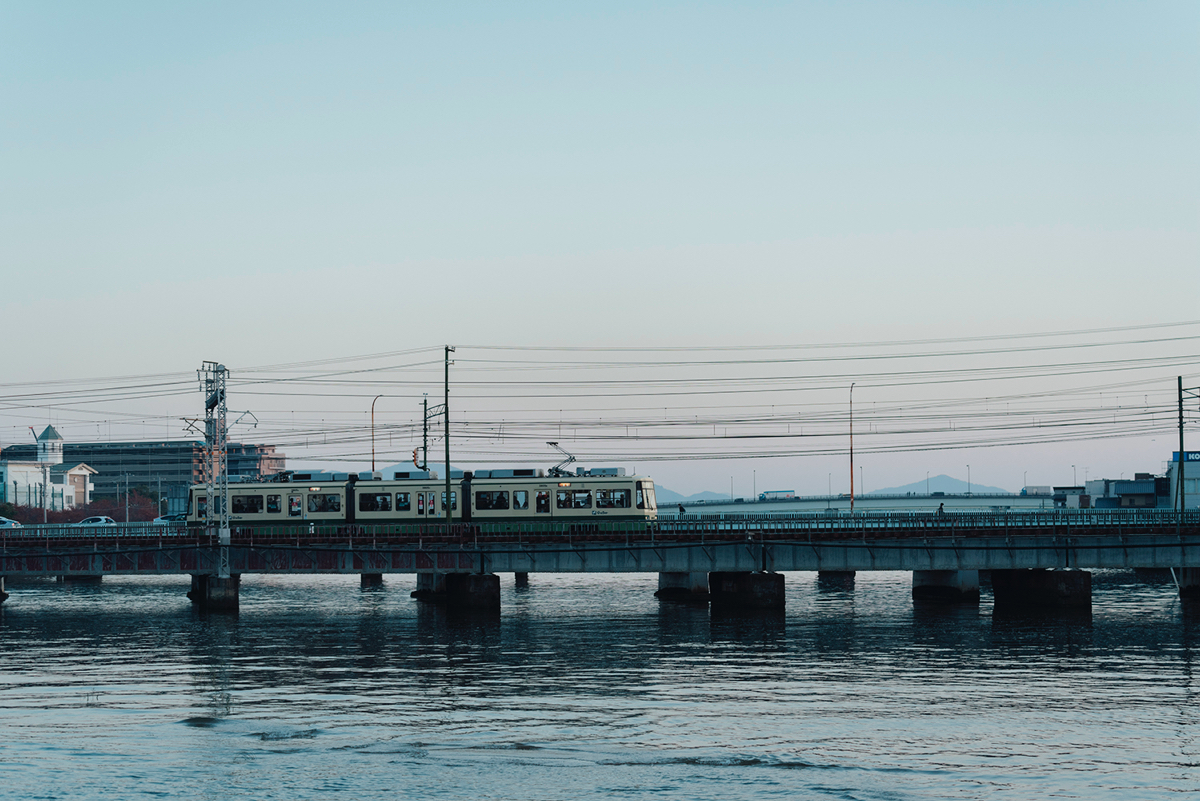 みやじませんウィーク〜 満潮時、陸橋を走る電車と川の水面が近づき、この場所ならではの風景を描く八幡川河口付近。県内有数の水鳥の飛来地としても知られています。