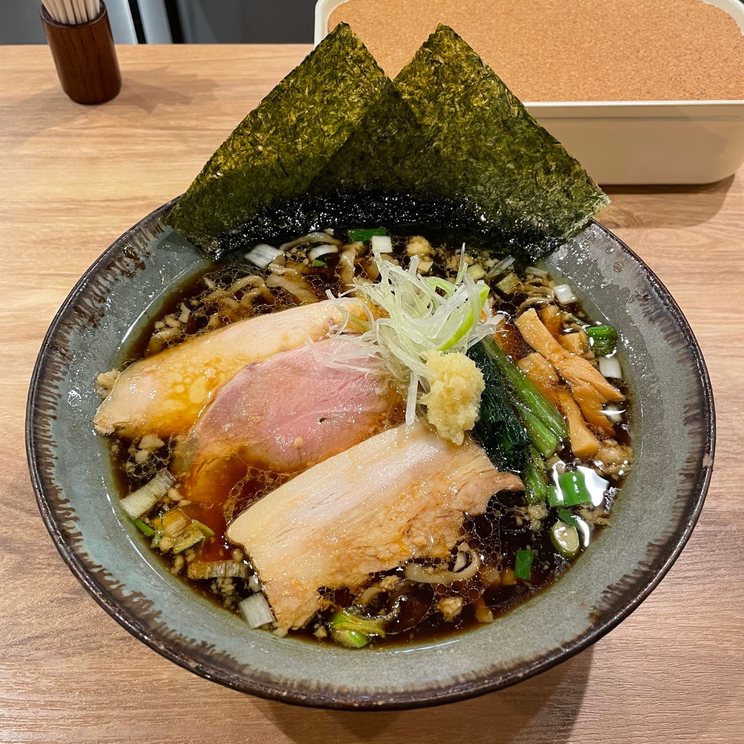 和田町の駅から歩いて5分くらい。北口から橋を渡って商店街を通って16号に出る手前を右に入ったところにある、ちょっとオシャレなラーメン屋さんです。 木曜日は生姜醤油DAY!いつもの醤油そばや塩そばもおいしいけど、この生姜醤油そばもまたうまいのです。 「2枚取れちゃって、すみません」って海苔を2枚つけてくれました。ありがとうございます。
