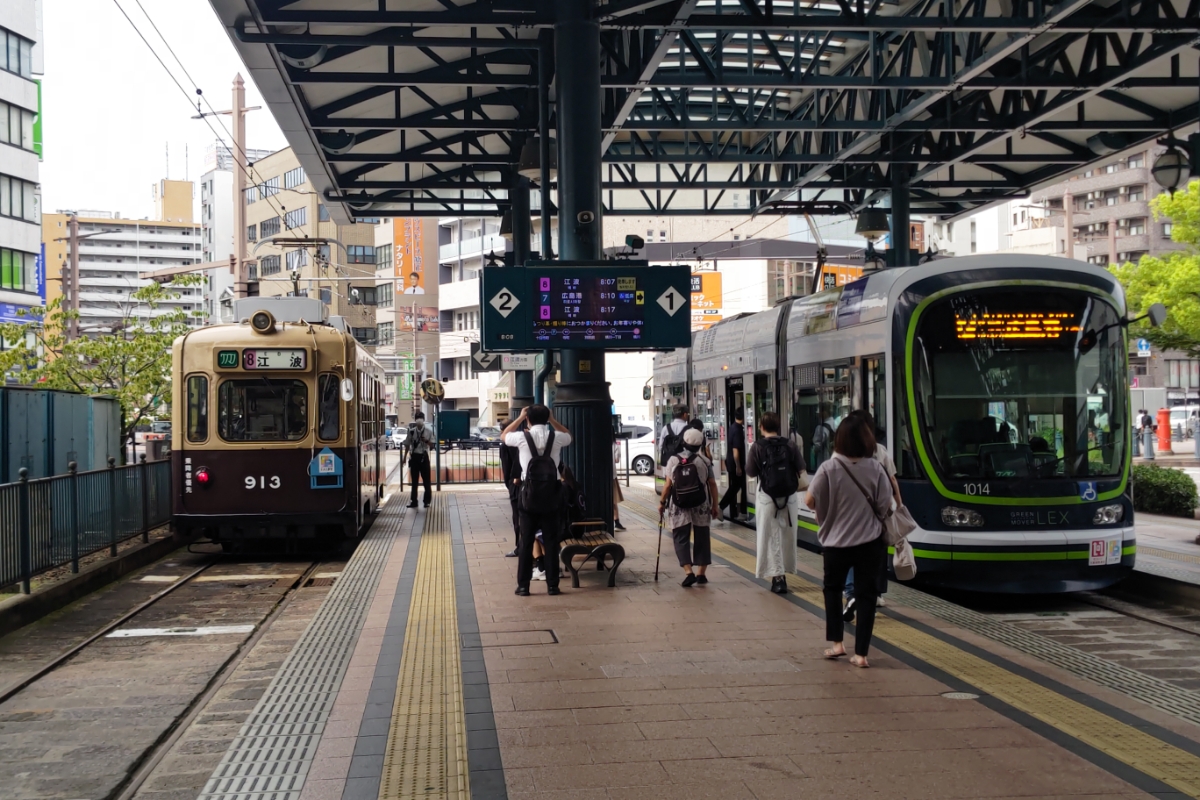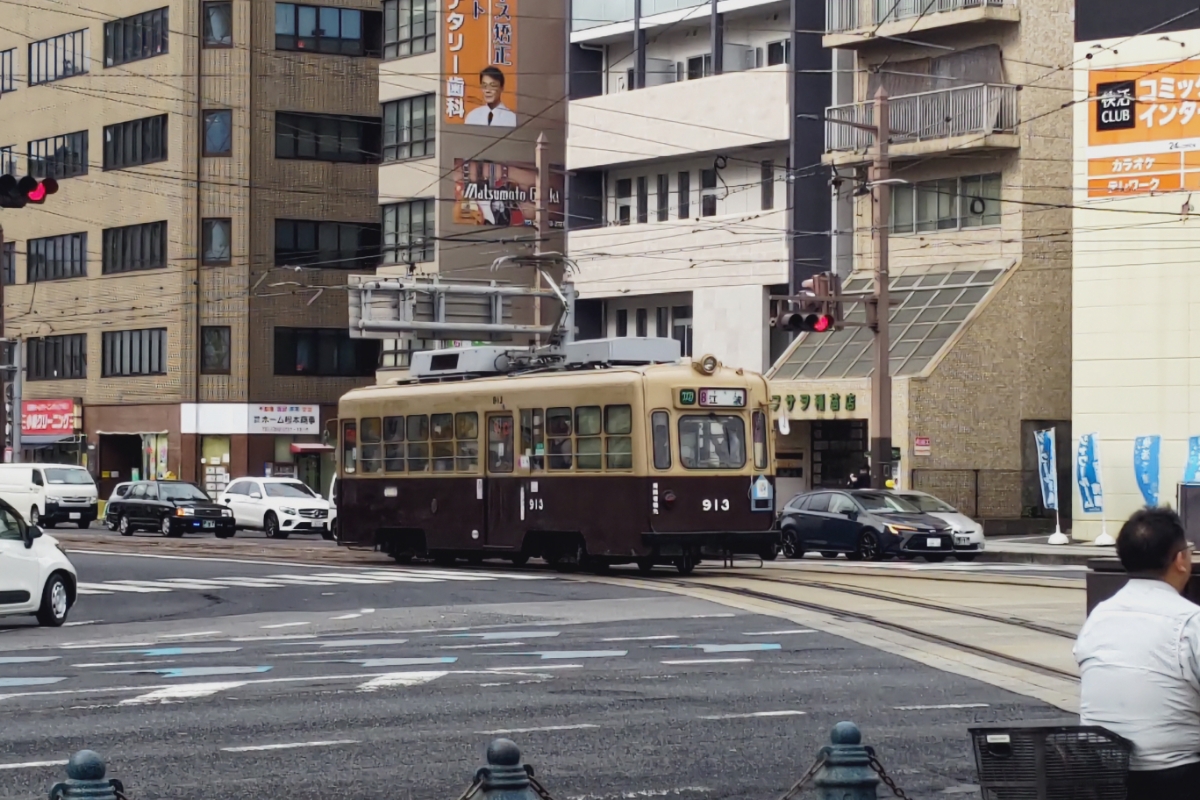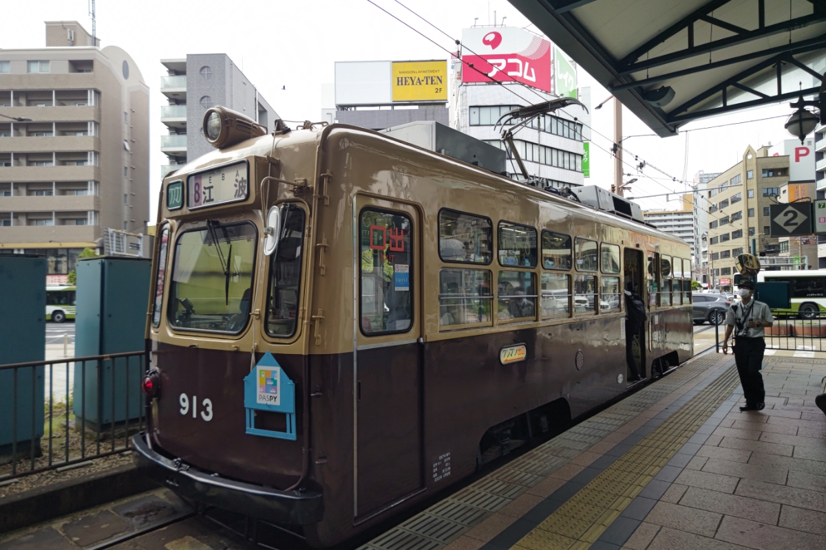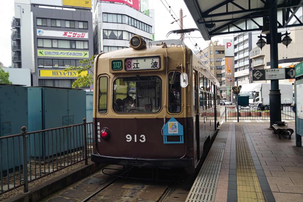 広電913は大阪市電からの移籍組。 他の広電電車に見られない車体デザインや行灯に、車体を作り替えた昭和30年代の流行を感じる。 横川駅前の大屋根の下、最新型に負けじと存在をアピールしていた。 朝の8系統でしか出番がなく、見る事も難しいレア車なので撮影にはとても苦労した。