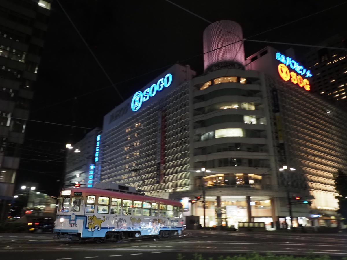 夜の紙屋町交差点を曲がる動物電車。こう見えて実は1956年生まれ、昔は神戸を走っていた大ベテランだったり。誰よりもカラフルで、誰よりもにぎやかなデザインに、いつも元気をもらえます。 後ろに見えるそごうは、広島らしく鯉のウロコをモチーフにした外壁のデザインが特徴的。おいしい食べ物に、トレンドの雑貨、期間限定ショップなどなど、いろんな出会いがあっていつ行っても楽しいお店です。