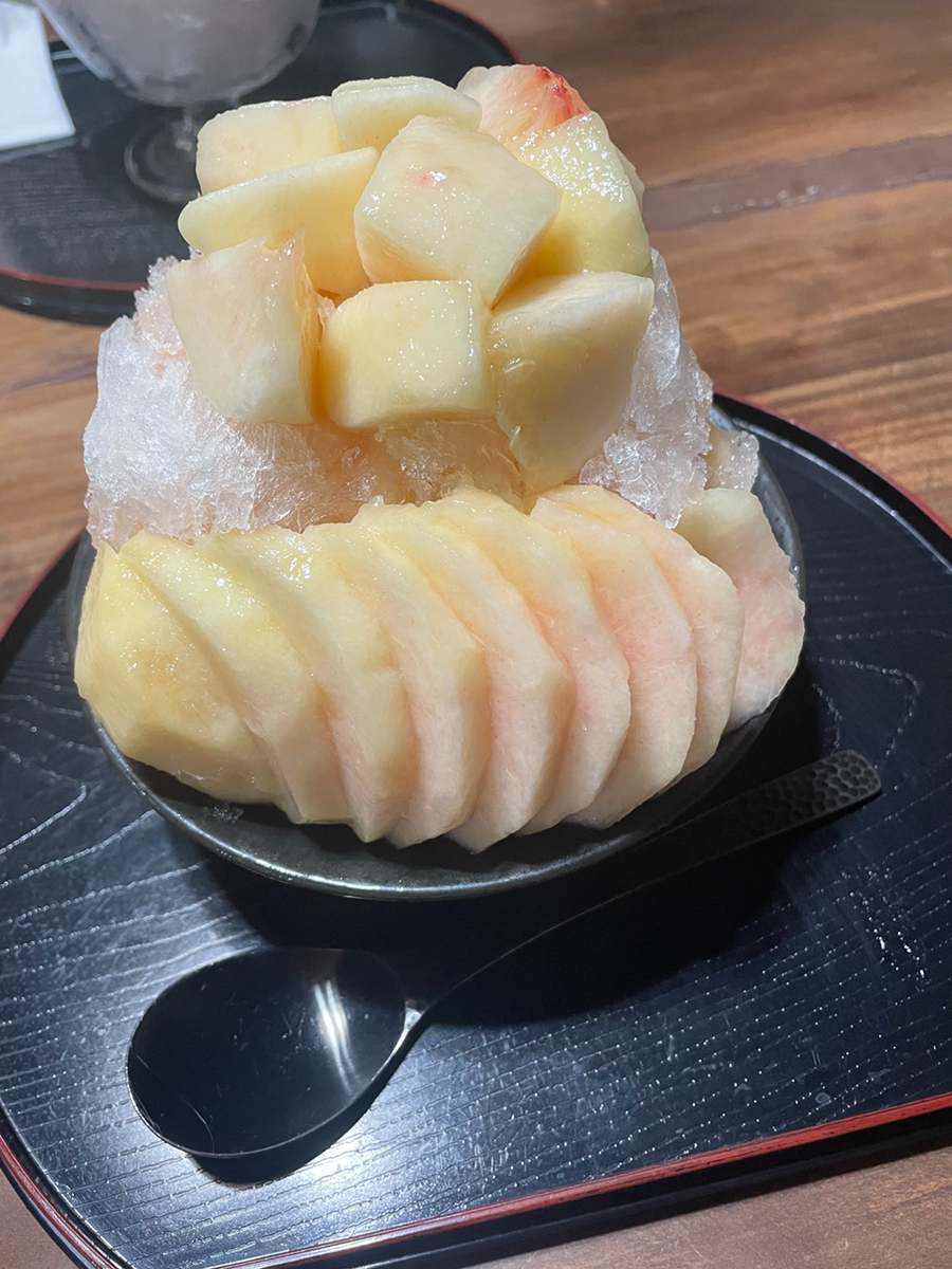 いちごミルクエスプーマと期間限定のもものかき氷をいただきました! 古民家のような雰囲気で、掘り炬燵の座席です。 予約してからの訪問をお勧めします!
